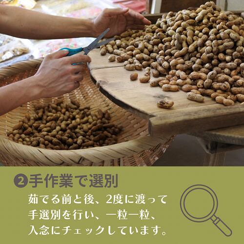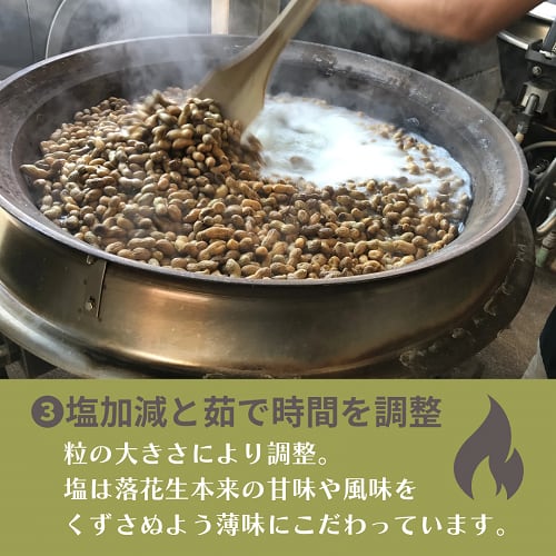 粒の大きさにより塩加減や茹で時間を調整しています。塩は落花生本来の甘みと風味を引き立たせる役目と考え、薄味にこだわっております。